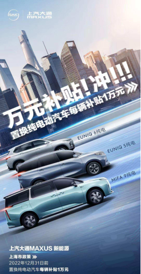 上海发布的《上海市加快经济恢复和重振行动方案》中指出:2022年12月31日前,个人消费者报废或转出名下在上海市注册登记且符合相关标准的小客车,并购买纯电动汽车的,给予每辆车10000元的财政补贴。由此可见现在置换新能源汽车其实就是不错的时机。
