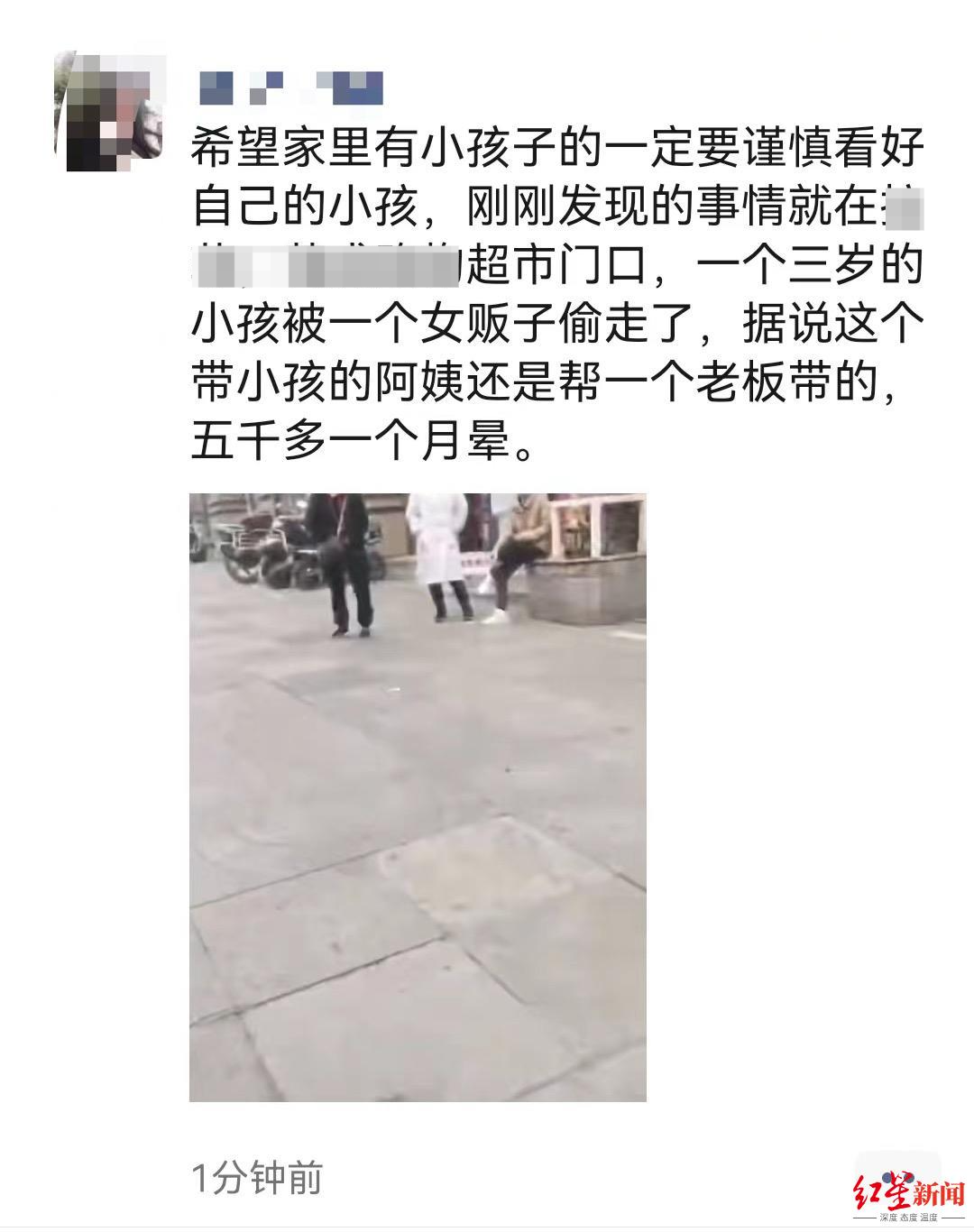 很快,有市民通过微信朋友圈发布相关消息称:“希望家里有小孩子的一定要谨慎看好自己的孩子。刚刚发现(生)的事情,某超市门口,一个三岁的小孩被一个女贩子偷走了……”记者获取的一段视频显示,多名围观市民在超市门口议论此事,有警察赶来超市。