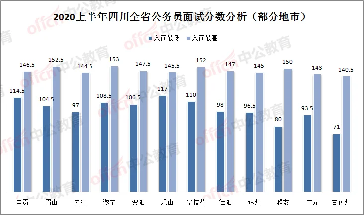 据中公教育分析,去年四川省考进面分数最低分来自甘孜州,总分71,行测30分,申论40分,笔试加分1分;高分来自遂宁,总分153,行测76分,申论77人。