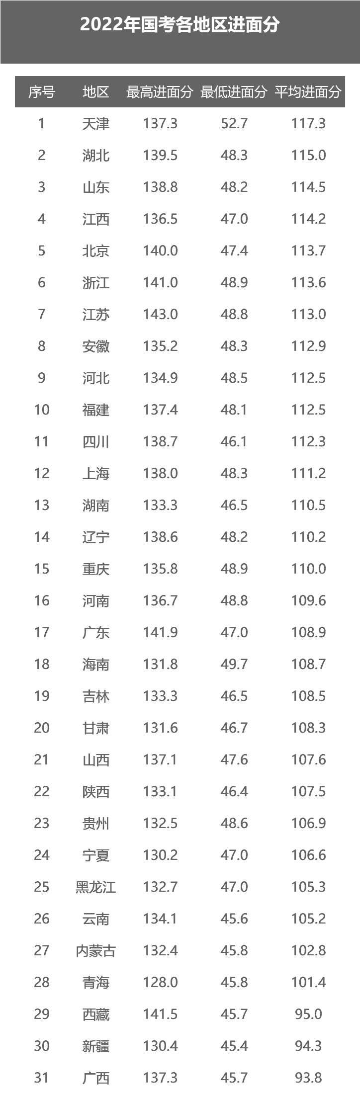 2022年国考平均进面分最高的地区是天津117.3分,其次是湖北115分;最高进面分出自江苏143分,紧跟其后是广东141.9分,出人意料的是西藏141.5分。