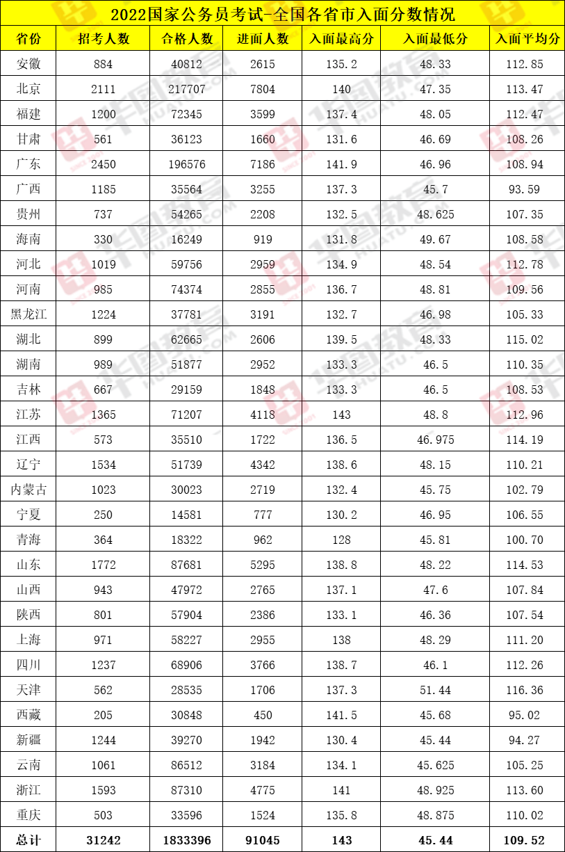 2022年国考入面分数线的最值当属最高、最低、平均值之最。其中最高入面分数线的省份为江苏,江苏国考入面最高分数为143分,在整个地市中分数也是最高进面分数,因此这位考生考出的成绩可用“笔试状元”来命名。其次,最低进面分数线为45.44分,属于新疆的一位国考考生。