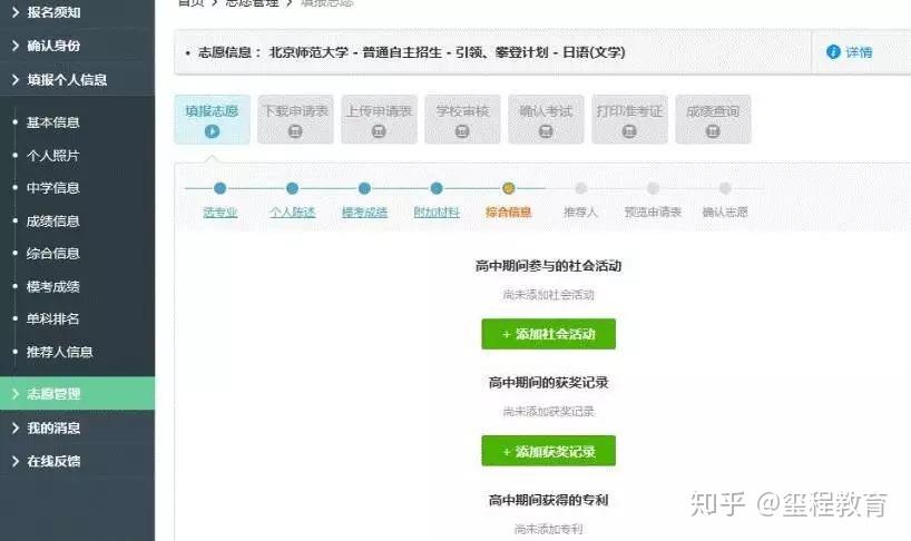 综合信息填写是我们报考自主招生的重中之重,也是各大高校在审核材料关键的地方,包括获奖证书和综合素质。首先是竞赛证书,要按照报考学校的要求,准备五大学科竞赛等其他学校认定的竞赛获奖证书。然后是发表论文的证明,并提供刊物扫描件,最后是专利证明。另外,我们也可以上传参加过的公益活动,实践活动的证明材料,曾经获得过得一些“三好学生”、“文明学生”之类的优秀称号。