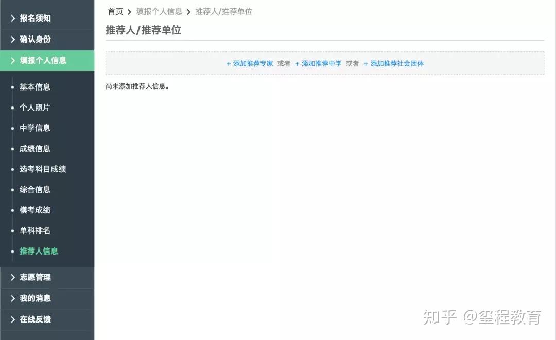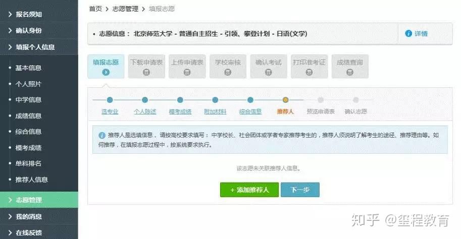 接下来这一步是“推荐人”的填写,需要考生通过点击绿色框框添加相应推荐人,如下图。添加完成确认无误后点击“下一步”