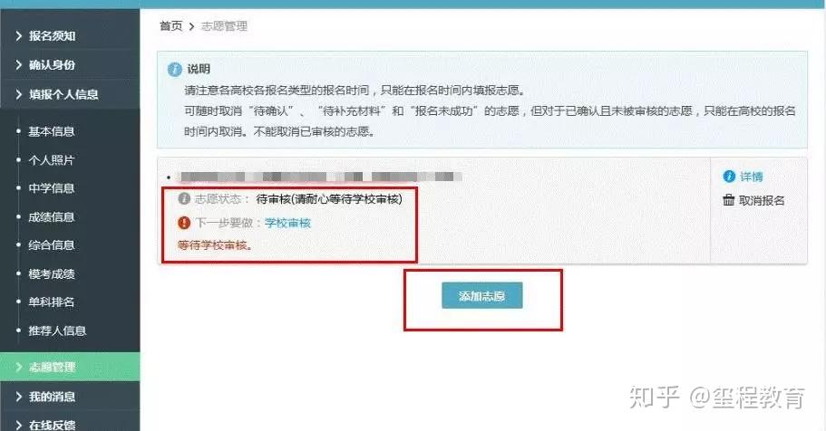 完成申请表上传后会跳转到志愿管理界面,如红色方框内显示“待审核”状态。此时说明已全部完成报名流程。