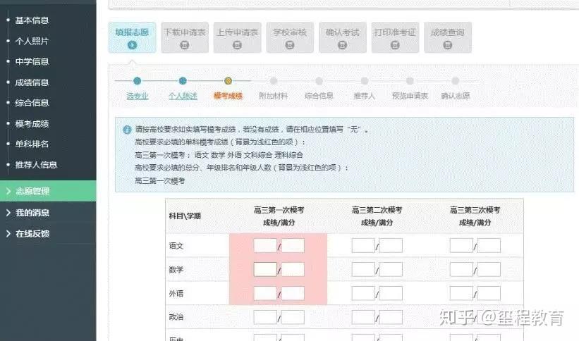 之前觉得自己每学期期末考试成绩不是很理想的考生们注意啦!!!挽救你期末成绩的机会来了,除了期末之外,我们还可以上传高三以来的模拟考试的成绩,如果你在模拟考试的成绩比较突出,就赶紧填上去吧!当然,如果你综合成绩不是特别好,但是明显偏科的话,在单科成绩里面填上你在某一学科上的天赋,毕竟自主招生相对于综合评价,更看重的是你某个学科方面的天赋和特长,所以在这里又是你大展身手的好机会!
