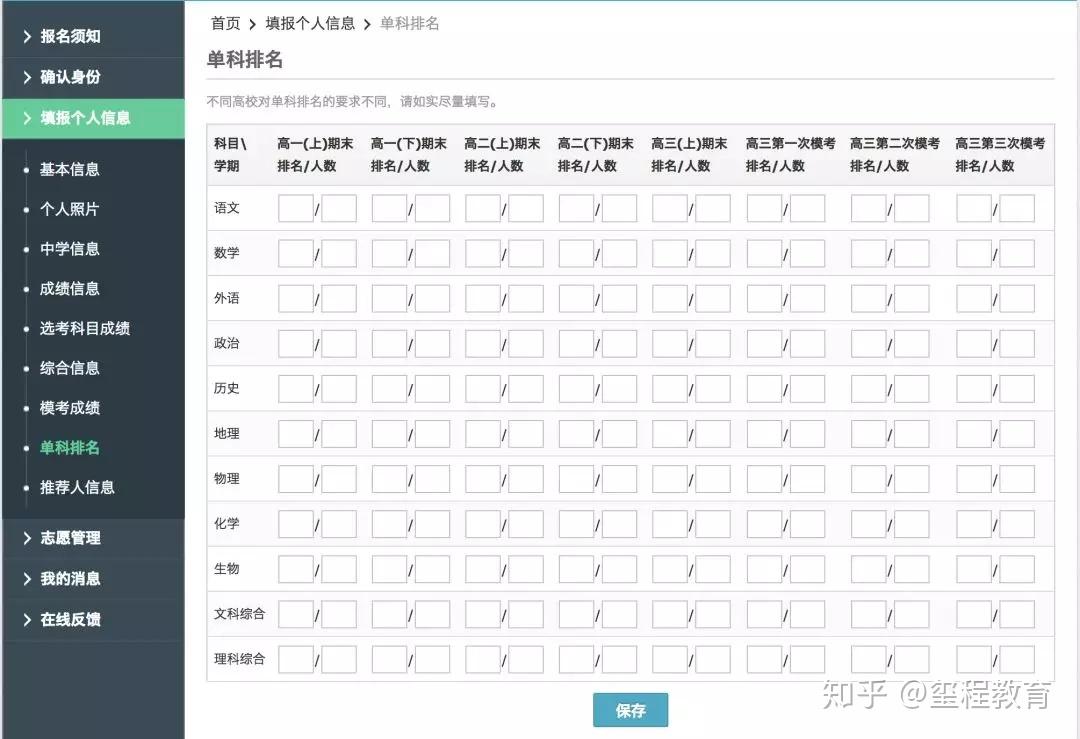 上传成绩信息以便后续报名,注意成绩填写是每学期期末的成绩,考生需要如实填写,模拟考试和期中考试的成绩则不要填写。如果有些同学期末成绩不是特别高或者排名不是很理想,不要慌张!我们在后面还有补救机会!
