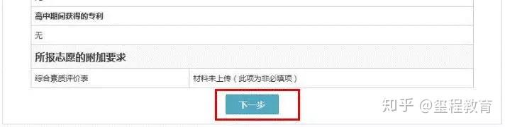 然后进入“附加材料”项,下面案例此时页面显示需提供“综合素质评价表”为附加材料,不同学校要求的附加材料肯定不同,具体根据学校要求进行添加。添加好后,则直接进入下一步。