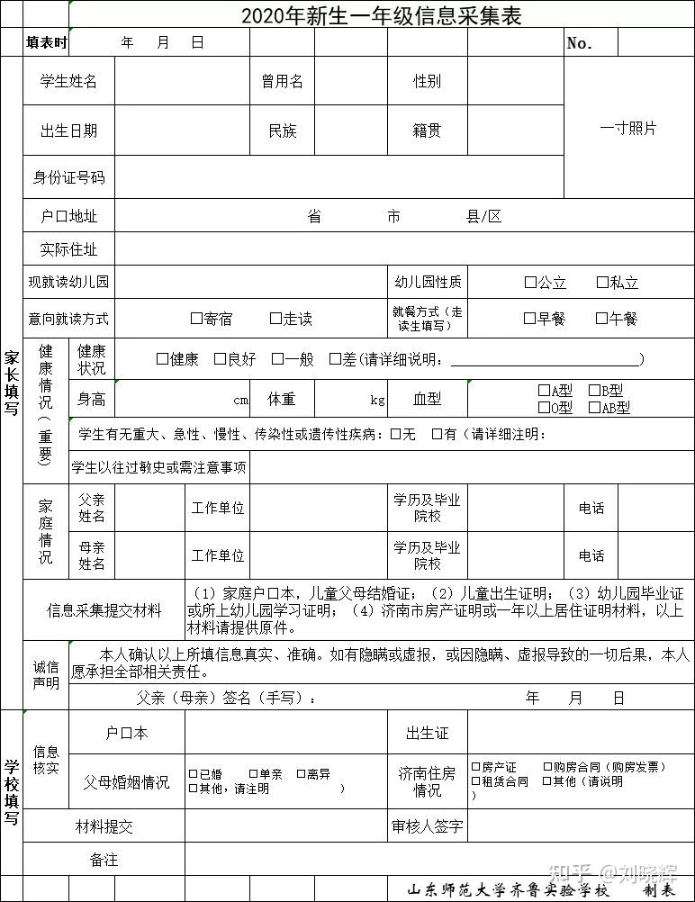 1、济南市区户籍(包括槐荫、市中、历下、天桥、高新、历城、长清、章丘、济阳、莱芜、钢城)学生需提供户籍证明:家庭户口本及父母身份证原件。如果孩子的户口与父母任何一方都不在一个户口本上的,需提供出生证明。 2、济南市区以外户籍学生,除需提供上述材料,还需要提供在济南长住证明,如居住证(公安机关出具的证件)或房产证明(房产证、购房合同、租房合同)等。 3、填写打印《新生报名表》,按以下要求认真填写,父母签名后带至报名现场上交(可电子填写后打印或打印后手写,确保字迹工整、清晰)。