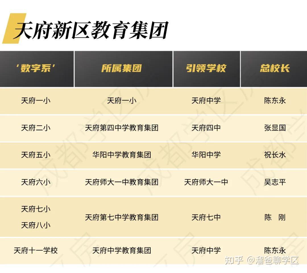 除了天府三小、天府四小不属于五大教育集团,其他小学都有归属: