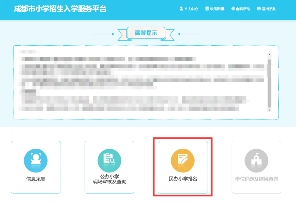 注册并登录服务平台后,请注意阅读“温馨提示”内容。如果当前时间在民办报名时间段内,“民办小学报名”模块将显示彩色,如下图,否则“民办小学报名”模块将是灰色,表示模块未开放。