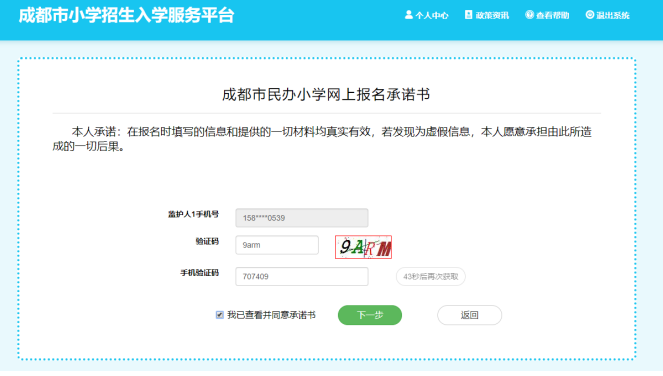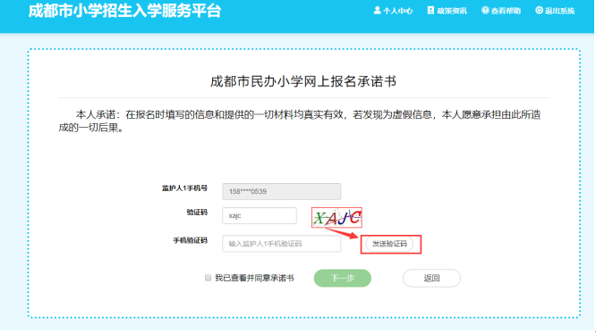 ▲请仔细阅读“成都市民办小学网上报名承诺书”,阅读完毕后,请输入图形验证码,然后点击“发送验证码”,系统将发送短信验证码到监护人手机号中。