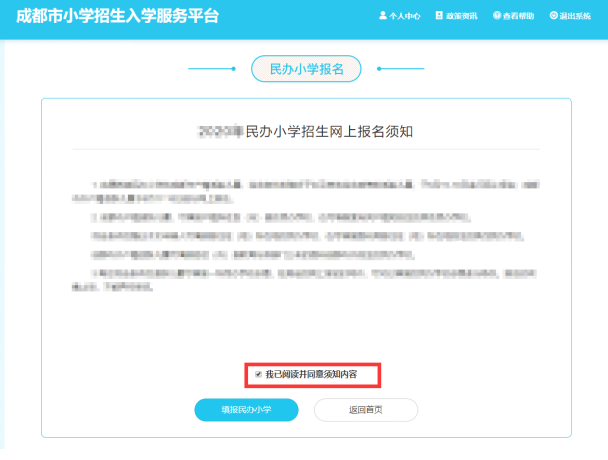 ▲请仔细阅读“2020年民办小学招生网上报名须知”,阅读完毕后勾选“我已阅读并同意须知内容”,点击“填报民办小学”。