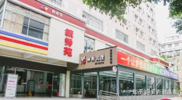 学校还有条商业街,一楼是全是商铺,有潮汕美食店、奶茶店、甜品店、麻辣烫、冒菜、快餐、西式快餐店等等,还可以外卖配送哦~