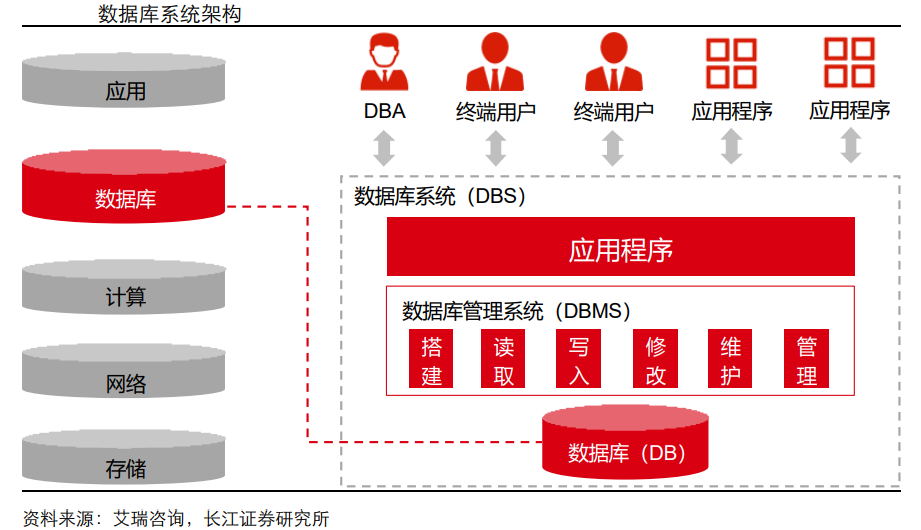 数据库(Database,DB)是按照一定的数据结构组织、存储、管理数据的大容量电子文件柜。数据库管理系统(Database Management System,DMBS)是负责数据库搭建、使用和维护的大型系统软件,它对数据进行统一控制管理,以保证数据的完整性和安全性。数据库、数据库管理系统、应用系统、数据库管理员和用户共同组成了数据库系统(Database System,DBS)。在计算机系统中,数据库处于 IT 架构的核心位置,向上是各种应用的支撑引擎,向下调动计算、网络、存储等基础资源。数据库与操作系统、中间件并列为三大基础软件,高度复杂且技术壁垒深厚,是我国信创产业攻关的核心领域。