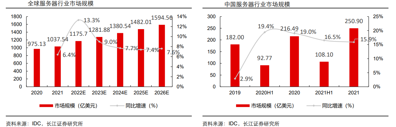 中国服务器市场增长迅速,持续领跑全球市场。据 IDC 统计,受新冠疫情、“缺芯”阻滞供应链等因素的影响,2021 年全球服务器行业的市场规模为 1037.54 亿美元,同比增长仅为 6.4%。相比之下,中国服务器行业自 2020 年以来的规模增速均在 15%以上,高于全球市场;2021 年市场规模为 250.90 亿美元,同比增长 15.9%,持续领涨全球。