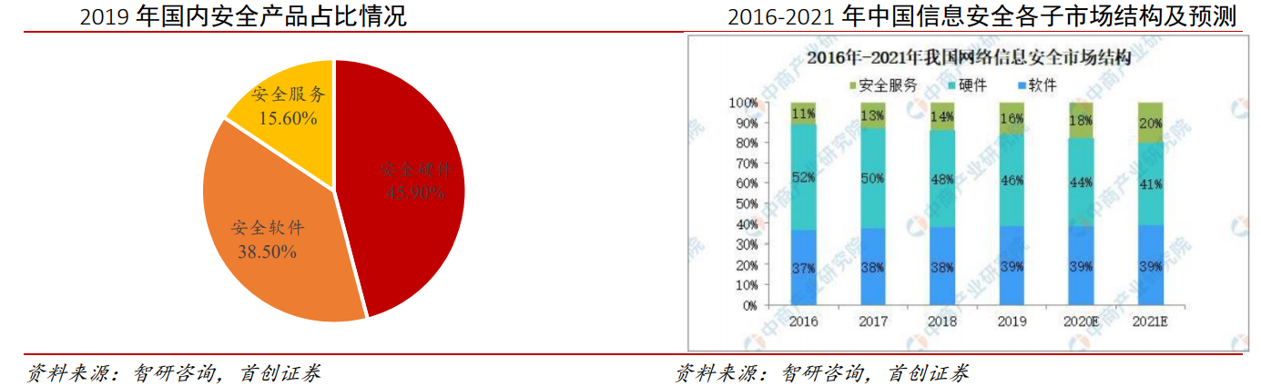 我国信息安全行业细分领域较多,龙头市占率低,行业集中度低。以 2019 年中国信息安全市场为例,安全硬件市场占比为 45.9%,安全软件市场占比 38.5%,安全服务市场占比 15.6%。这主要由于机构客户资产管理和采购制度的传统规则约束,导致产品以软硬件结合产品为主导。同时,在网络建设阶段多采用的是涉及协议栈层级较低的安全产品,而涉及应用层的安全产品需求相对滞后于基础设施建设期,这样的产品结构也反映了我国网络安全建设仍在发展阶段。