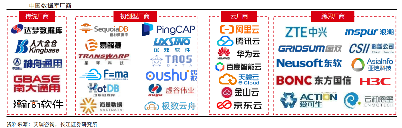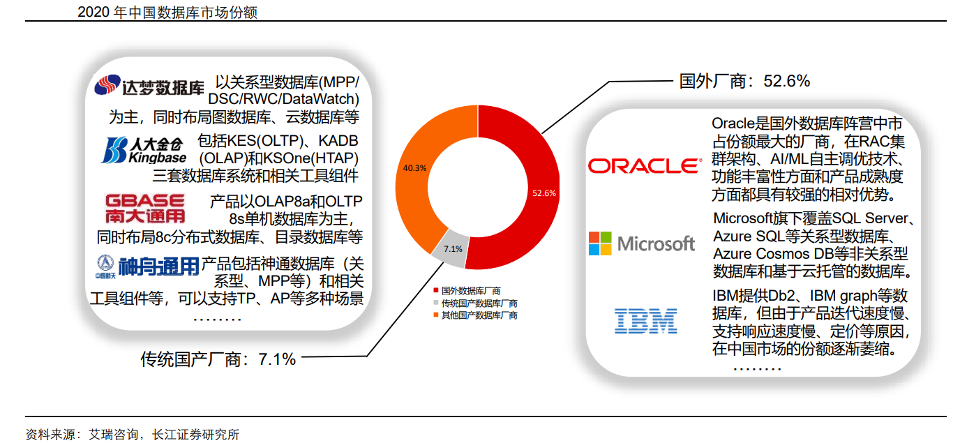 近年来本土厂商拓展迅速,2020 年国产化占比已达 47.4%。据艾瑞咨询统计,借助政策红利,以及多年的技术积累与服务经验,国产厂商的市场份额逐年提升,至 2020 年市场份额已经达到 47.4%。相比之下,Oracle、Microsoft、IBM 等国外厂商虽然在 OLTP的核心场景还拥有较高的市占率,但在整体市场中下滑明显,至 2020 年市占率已降至52.6%。本土厂商中,以“达梦、人大金仓、南大通用、神舟通用”为代表的传统型厂商近年来不断发力,从购买源码、借助开源逐步走向自主研发,实力提升显著,在信创政策的大力支持下,不断向党政、金融、运营商、能源电力、交通等行业加快拓展。与此同时,初创厂商、云厂商、ICT 厂商也开始发力数据库市场,为国产阵营添砖加瓦。