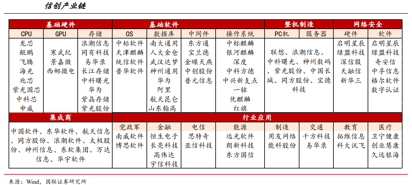 从产业链角度看,信创产业可分为基础硬件、基础软件、应用软件、信息安全四大板块。其中,基础硬件包括:芯片、服务器/PC、存储、交换机、路由器等;基础软件包括:数据库、操作系统、中间件等;应用软件包括:OA、ERP、办公软件、政务应用、流版签软件等;信息安全包括边界安全产品、终端安全产品等各类产品。
