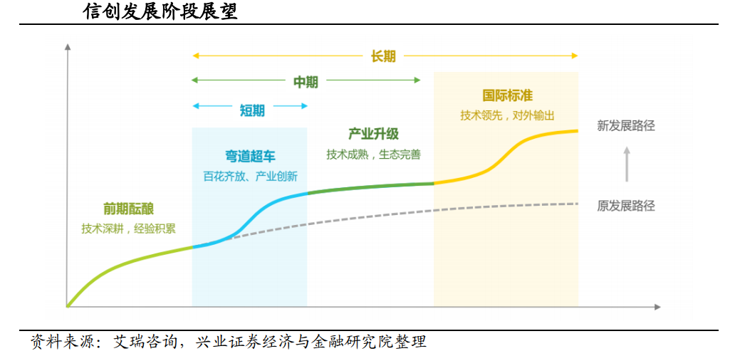 信创正向行业端不断推进,逐步建立国产化技术生态。建设前期,信创以政策激励为主要驱动力;随着行业信创推进,国产 IT 产品正不断从“可用”到“好用”过渡。从短期来看,政策推进带来产业不断孵化和格局重塑;从长期来看,行业成熟度和集中度不断提高,从而进一步实现产业升级和技术迭代,不断和国际标准接轨,建立国产化技术生态。