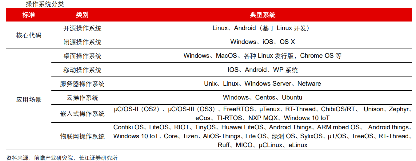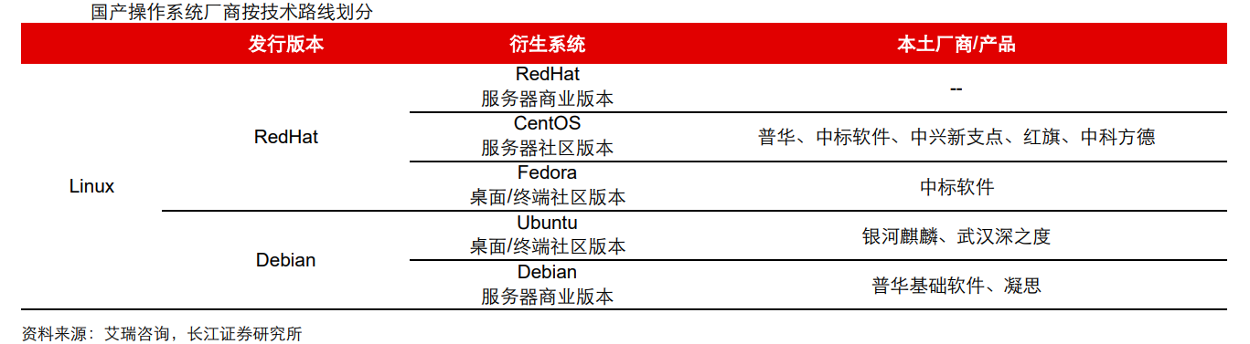 国产操作系统大多为以 Linux 为基础二次开发的操作系统。国产操作系统大多是本土厂商以 Linux 内核为基础,对内核代码进行修改和补充,加入 GUI(图形界面)、应用等部分,最终形成相应的 Linux 发行版。Linux 的发行版本主要分为两类:一类是商业公司维护的版本,以 Redhat 为代表;另一类是社区组织维护的版本,以 Debian 为代表。在基于 Debian 版本衍生的系统产品中,代表性厂商包括麒麟软件、武汉深之度、凝思等,而基于 RedHat 版本而打造产品的本土厂商则包括普华、中标软件(后整合为麒麟软件)、中兴新支点、红旗以及中科方德等。