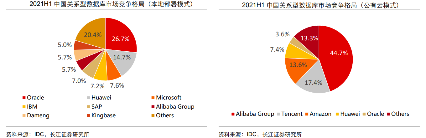 在关系型数据库市场中,本地部署模式的国产化程度低,公有云模式的国产化程度高。过去一年里,本土厂商的市场份额迅速扩大,尤其是在政府行业,以达梦数据库、人大金仓为代表的传统型厂商实现爆发增长。据 IDC 统计,在本地部署模式下的关系型数据库市场中,Oracle、Microsoft、IBM、SAP 分别占比 26.7%、7.6%、7.2%、7.0%,合计占比 48.5%,而华为、阿里巴巴、达梦、人大金仓仅占 14.7%、5.7%、5.7%、5.0%,可见目前本土厂商虽成长迅速,但国际厂商仍占主导地位。在公有云模式下的关系型数据库市场中,阿里巴巴、腾讯、Amazon、华为、Oracle 分别占比 44.7%、17.4%、13.6%、7.4%、3.6%,国产化比例较高。从集中度来看,总体关系型数据库市场、本地部署模式市场、公有云模式市场的 TOP 厂商份额分别为 69.5%、63.3%、86.7%,都具有较高的市场集中度。