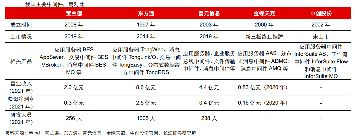 东方通营收规模最大,与普元信息、宝兰德等各自具备自身的优势领域。国产中间件厂商中,东方通、普元信息以及宝兰德三家企业的市占率最高,具备明显的竞争优势。其中,东方通成立时间最早,营收规模也最大,2021 年实现收入 8.6 亿元。相比之下,宝兰德成立时间最晚,2021 年实现收入 2.0 亿元,营收规模介于东方通、普元信息两家头部上市公司与金蝶天燕、中创股份之间。从行业应用来看,东方通在电信和政务两个领域优势明显,普元信息是在金融领域,宝兰德则是在电信及政务领域。
