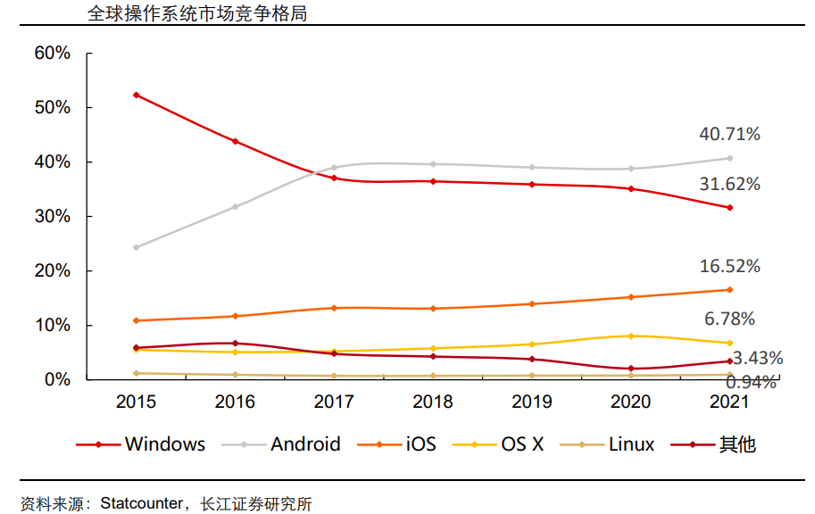 全球操作系统市场主要由 Windows、Android、iOS、OS X 以及 Linux 垄断,CR5高达 96.57%。在全球操作系统市场中,目前主要有 Windows、Android、iOS、OS X、Linux 五大操作系统参与竞争。其中,微软依靠“WinTel”+“软件付费”模式,主导着桌面 OS 与服务器 OS 市场,而谷歌依靠“Android+ARM”+“免费流量+增值服务”模式,成为移动 OS 龙头厂商。据 statcounter 统计,2021 年,Windows、Android、iOS、OS X、Linux 分别占比 31.62%、40.71%、16.52%、6.78%、0.94%,合计份额为 96.57%,市场集中度较高。此外,近些年随着智能手机等移动设备的快速普及,Android 系统的市场份额增长迅速,并在 2017 年首次反超 Windows。