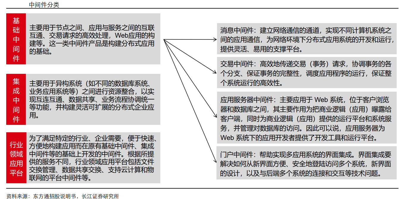 中间件的功能特点及自身定位决定了其分类的多样性,具体而言,中间件可分为基础中间件、集成中间件和行业领域应用平台。其中,基础中间件是构建分布式应用的基础,也是集成中间件和行业领域应用平台的基础,主要包括交易中间件、消息中间件、应用服务器中间件、门户中间件等。
