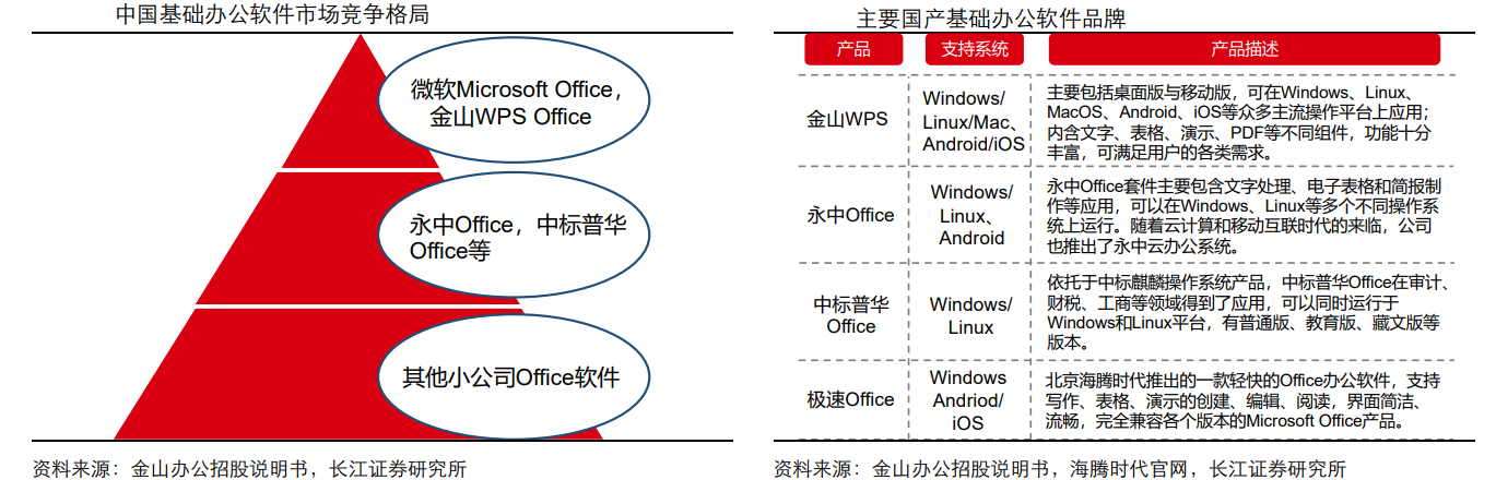国内基础办公软件市场中,微软与金山同处第一梯队,永中、中标等本土厂商持续追赶。办公软件行业由于具有技术门槛较高的特点,需要投入大量的时间成本和人力成本,所以头部企业的话语权较强。国内基础办公软件市场中,仅有少数厂商参与竞争,除微软的 Microsoft Office 外,目前国内典型的办公软件为金山 WPS、永中 Office 和中标普华Office。经过多年发展,国内桌面市场形成了微软、金山公司同台竞争,永中软件、中标软件等厂商持续跟进的竞争态势。