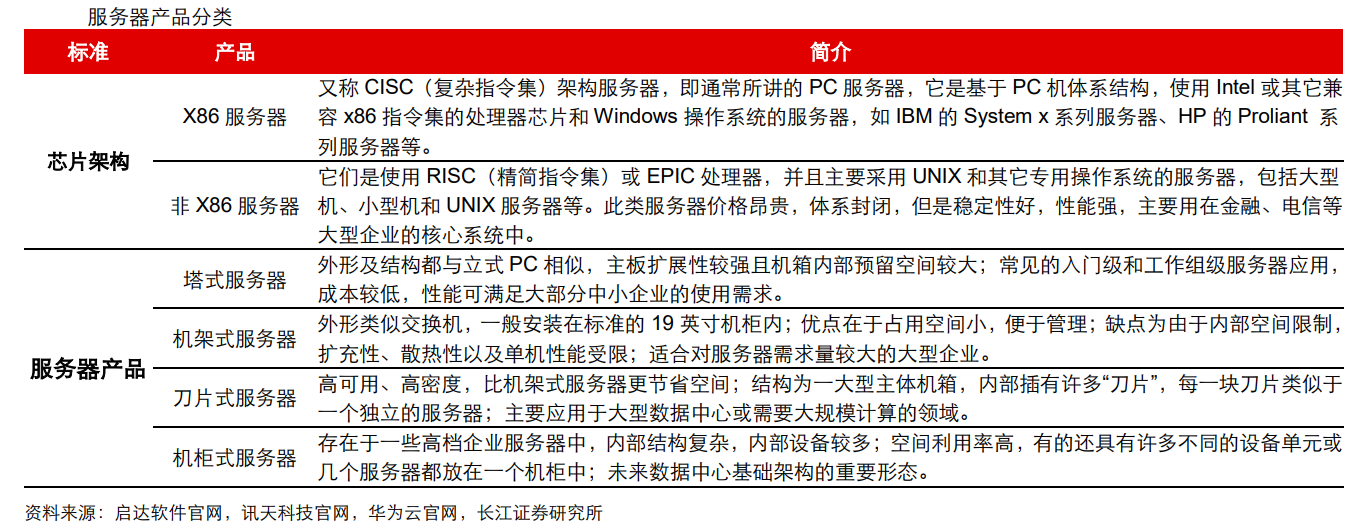 服务器是指在网络环境下对外提供服务的高性能计算机。目前,大部分互联网结构都是基于客户机-服务器模型,其本质主要为客户机请求、服务器响应,即服务器响应客户机请求,将数据提交给客户机,然后由客户机对数据进行计算,并向用户呈现计算结果。作为互联网上的网络节点,服务器存储、处理网络上 80%的数据、信息,因此也被称为网络的灵魂。服务器与普通的个人电脑功能类似,只是相对于个人电脑,服务器在稳定性、安全性、性能等方面都要求更高。按照芯片架构来看,服务器可分为 X86 架构服务器以及非 X86 架构服务器(ARM 为主)。按照服务器产品来看,服务器主要包括塔式、机架式、刀片式以及机柜式服务器。