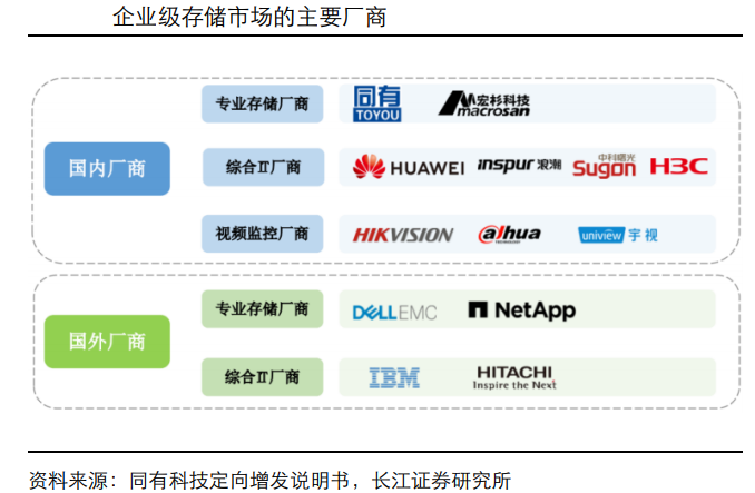 按照主营业务,存储厂商主要分为综合 IT 厂商与专业型厂商两类。其中,综合 IT 厂商侧重于提供一揽子整体 IT 解决方案,存储产品作为整体系统的一个环节,产品形态更为标准化,毛利率相对较高。相比之下,专业型厂商一般专注于存储系统底层,行业Know-how 优势明显,具备较强的个性化开发能力,同时产品售后服务的响应速度也更为迅速。目前,综合 IT 厂商主要包括 IBM、HITACHI 等国外厂商,华为、浪潮、中科曙光、新华三等一般性综合 IT 厂商,以及海康威视、大华股份、宇视科技等专攻视频存储领域的综合 IT 厂商。专业型厂商则包括 Dell、EMC、NetApp 等国外厂商,以及同有科技、宏杉科技等本土厂商。
