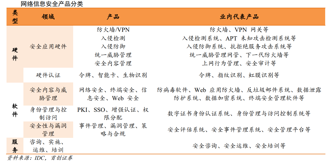 信息安全产品可分为硬件、软件和服务三大类,目前仍以硬件、软件类产品为主导。