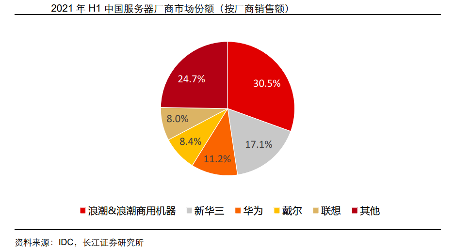 中国服务器市场的行业集中度高,且基本为国产厂商。据 IDC 统计,按照厂商销售额口径,2021 年 H1 中国服务器市场 Top5 厂商依次为浪潮、新华三、华为、戴尔和联想,分别占比 30.5%、17.1%、11.2%、8.4%、8.0%,合计份额为 75.3%,行业集中度较高且基本为国产厂商。可见,我国在服务器整机业务上已经具备较高的自主可控程度。不过,在 CPU、GPU、存储芯片等核心零部件领域,我国的服务器厂商仍需从海外采购,国产替代有待突破。