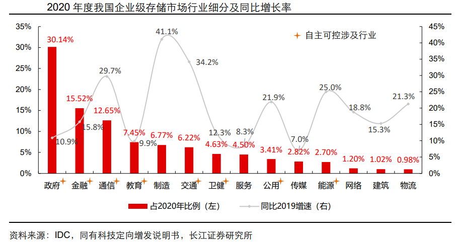 未来我国企业级存储系统市场有望保持稳步增长,具备广阔的国产替代空间。据 IDC 统计,2020 年中国企业级存储系统的市场规模成功突破 50 亿美元,预计 2025 年有望达到 77 亿美元,继续保持稳步增长。从市场结构来看,前三大细分行业分别为政府、金融、通讯,合计占比 58.31%,同比增幅分别为 10.9%、15.8%、29.7%。此外,政府、金融、通信、教育、交通、卫健、公用、能源等行业均为我国推进自主可控的重点领域,对应市场规模现已超过 40 亿美元,合计占比超过 80%,本土存储厂商的国产替代空间广阔。
