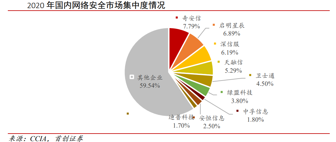 行业集中度偏低,前 5 名市占率为 31%。根据 CCIA 等数据统计,2020 年中国网络安全行业奇安信市占率第一,占比 7.80%。其余的核心企业为:启明星辰、深信服、天融信、卫士通、绿盟科技、安恒信息、中孚信息和迪普科技。