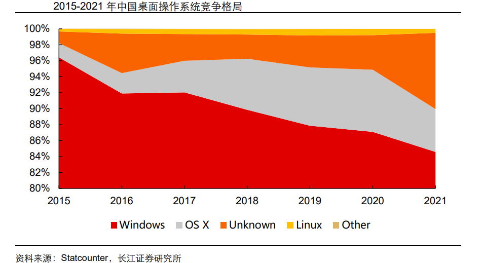 目前国产 OS 厂商的市场份额相对较低。据 Statcounter 统计,在中国桌面操作系统市场中,2021 年 Windows、macOS、Unknow(未知)、Linux的市占率分别为 84.57%、5.38%、9.55%、0.49%。可见,目前 Windows、macOS 仍处于主导地位,近年来在国内市占率虽逐步下降,但依然占有 90%左右的市场份额。国产操作系统主要在 Linux 分类,市占率还有待提升。国产操作系统中,麒麟与统信目前的竞争实力最强,呈现双寡头格局,其中麒麟常年占据中国 Linux 市场占有率第一。不过,由于国产 OS 产业仍处发展初期,尚未形成稳定清晰的市场格局,所以传统厂商、科技巨头及创业公司均有机会。在信创市场领域,经过之前的市场竞争,中国软件逐步提升自身份额,呈现细分行业龙头潜力。