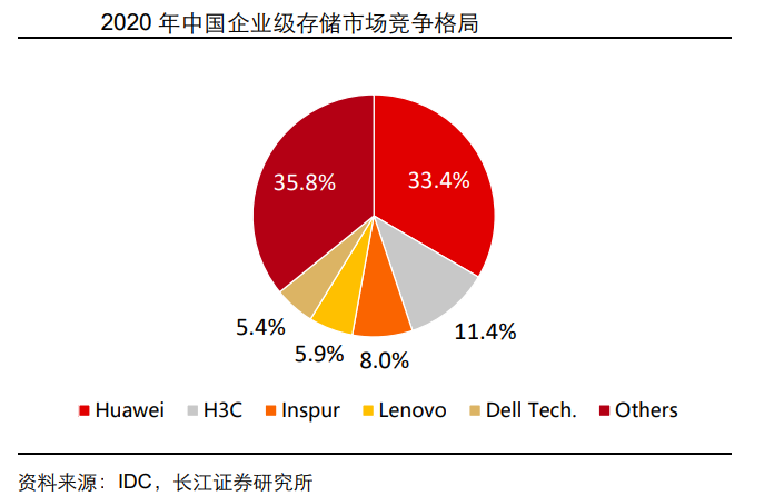 我国存储市场较为集中,本土厂商现已占据主要市场份额。据 IDC 统计,2020 年中国企业级存储市场的 Top5 厂商分别为华为、新华三、浪潮、联想及戴尔,分别占比 33.4%、11.4%、8.0%、5.9%、5.4%,合计份额高达 64.1%,市场集中度较高。并且,华为、浪潮、中科曙光、同有、宏杉等本土厂商的总市占率为 81.2%,已占据国内存储市场主要份额。