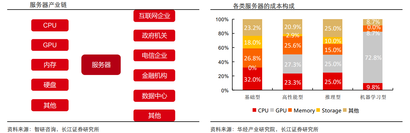 芯片、内存及存储器是服务器的成本大头。服务器主要由 CPU、GPU、内存、硬盘、主板、网卡等组件构成,对应的上游厂商包括芯片厂商、存储厂商等,主要应用于互联网、政府、电信、金融以及数据中心等行业领域。基于功能需求的不同,服务器内部组件的成本占比也会有所不同。据 IDC 统计,在基础型服务器中,芯片的成本占比相对较低,仅有 32%,内存及存储器的占比可达 44.8%。而在性能或运算能力要求更高的服务器类型中,芯片的成本占比可达 50%-83%,内存及存储器的占比则下降至8.7%-28.5%。