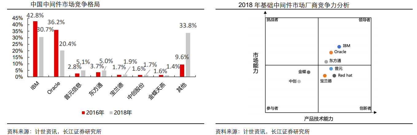 本土中间件厂商现已打破 IBM 和 Oracle 的市场垄断,未来有望获取更大的市场份额。在我国中间件行业中,国际知名厂商 IBM 和 Oracle 早期以领先的产品技术占据了主要市场份额。不过,随着国产中间件技术的持续升级,以东方通、宝兰德和普元信息为代表的本土厂商,近年来在电信、金融、政府、军工等行业逐步打破了 IBM 和 Oracle 的垄断。据计世资讯(CCW Research)统计,2016 年 IBM 和 Oracle 的合计份额为 79%,普元信息、东方通、宝兰德、中创股份、金蝶天燕五大厂商的合计份额仅为 11.4%。到2018 年,IBM 和 Oracle 的合计份额降至 51.1%,前五大本土厂商的合计份额为 15.1%,国际厂商的市占率下降明显。