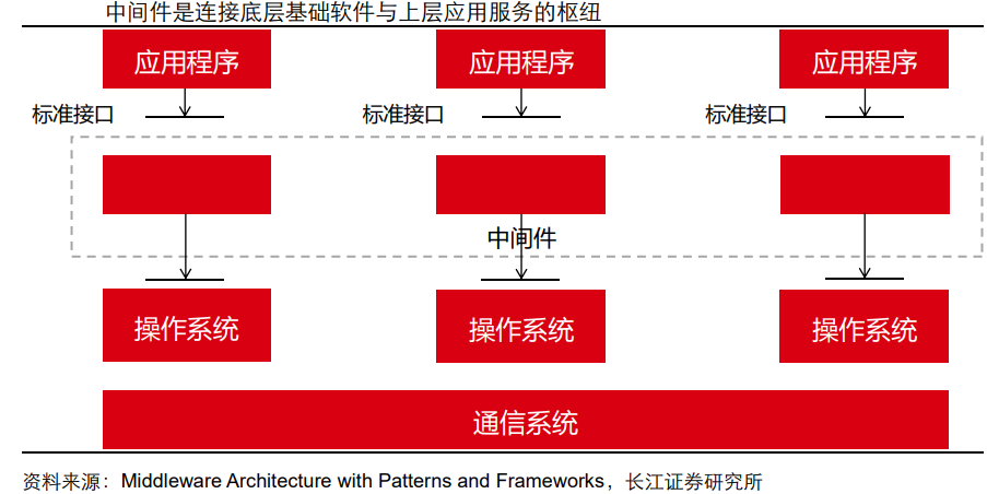 中间件是连接底层基础软件与上层应用服务的枢纽。中间件是指网络环境下处于操作系统、数据库等基础软件和应用软件之间起连接作用的分布式软件。它位于操作系统、网络和数据库之上,应用软件之下,主要作用是为处于自己上层的应用软件提供运行与开发的环境,帮助用户灵活、高效地开发和集成复杂的应用软件。作为连接上层应用和底层资源的桥梁,中间件能够屏蔽基础硬件、操作系统和通讯协议的异构性,为应用开发者提供统一标准的交互界面。