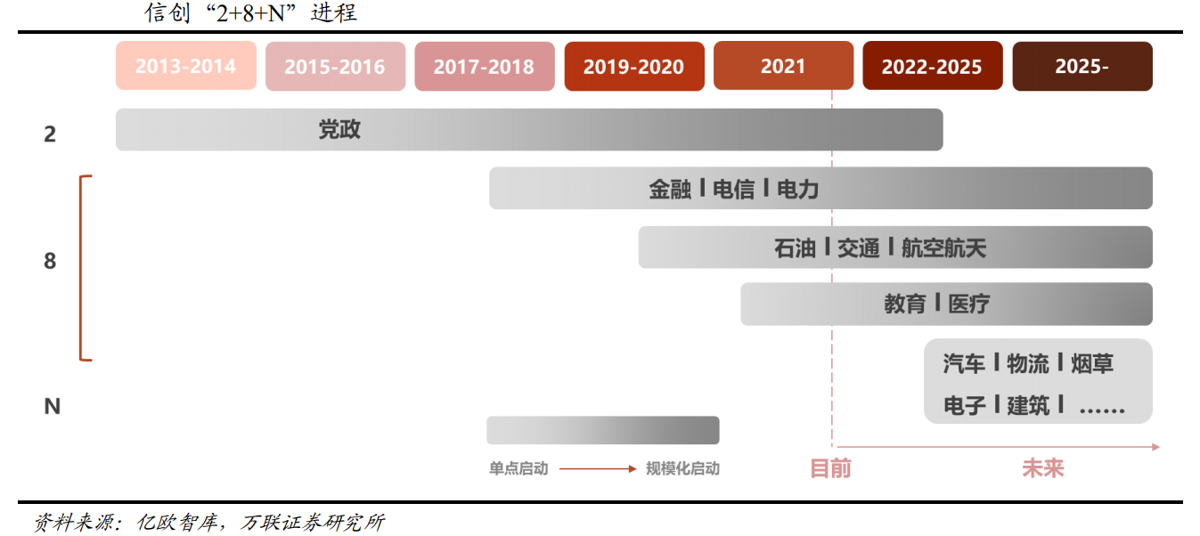 政策陆续出台推动信创产业高质量发展。2013 年底,中央办公厅等部门启动“党政电子公文系统”升级试点,正式拉开党政信创发展序幕;2021 年 9 月,《关键信息基础设施安全保护条例》正式生效,明确将八大行业界定为关键信息基础设施落地领域;2022 年 1 月,发改委印发《“十四五”推进国家政务信息化规划》,明确到 2025 年国家电子政务网基本实现政务信息化的安全可靠应用;2022 年 1月,国务院印发《十四五数字经济发展规划》,提出要补齐关键技术短板,集中突破高端芯片、操作系统、工业软件等领域。