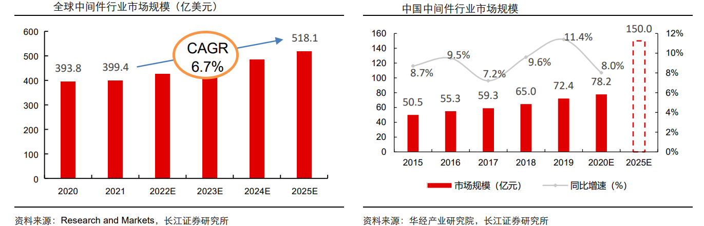 2020-2025 年中国中间件市场的 CAGR 为 13.9%,高于全球市场。全球方面,据Research and Markets 的研究,受疫情影响,2021 年全球中间件行业的市场规模为399.4 亿美元,较去年仅增长 1.4%。预计 2025 年市场规模将增长至 518.1 亿美元,2022-2025 年 CAGR 为 6.7%。中国方面,据华经产业研究院统计,2020 年我国中间件行业的市场规模约为 78.2 亿元,同比增长 8.0%,近年来市场增速基本保持在 8%左右。在云计算、区块链等技术革新,以及信创战略持续推进的催化下,预计 2025 年市场规模有望达到 150 亿元,2020-2025 年 CAGR 为 13.9%,明显高于全球市场。