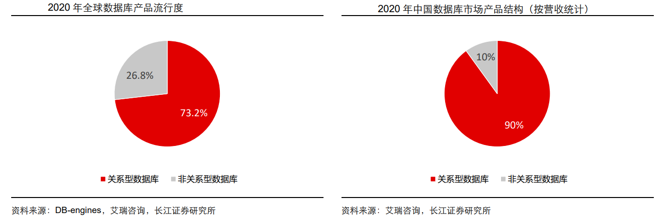 全球及中国数据库市场均以关系型数据库为主。结合 DB-engines 与艾瑞咨询的研究资料,2020 年,在全球数据库市场中,关系型数据库的流行度为 73.2%,远高于非关系型数据库的 26.8%。在中国数据库市场中,关系型数据库凭借“业务价值高、应用场景广”等优势,收入占比高达 90%;非关系型数据库仅占比 10%,主要收入来自云厂商的服务费(托管在公有云上的 NoSQL 开源产品),目前虽占比较低,但未来具备广阔的成长空间。