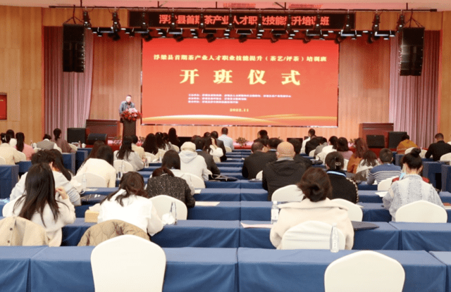 浮梁县委常委、县委组织部部长王天才出席开班仪式并讲话,浮梁县副县长应飞主持开班仪式,中国农业科学院茶叶研究所、浙江大学茶学系茶叶感官审评师李方虎等专家,景德镇市茶...