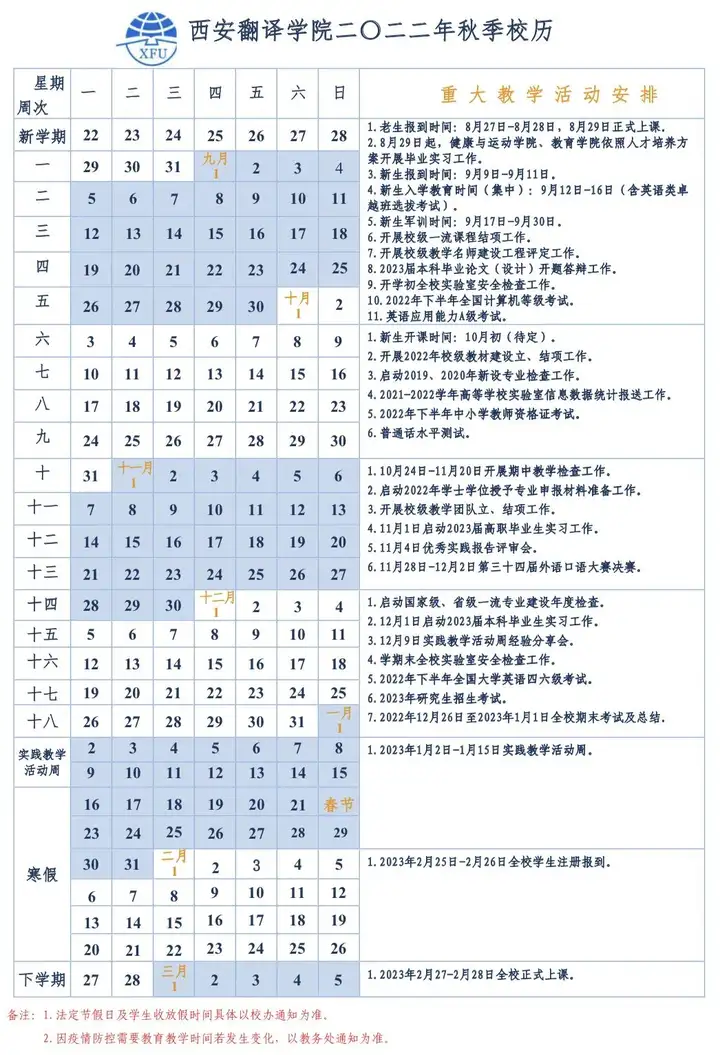2022年秋季校历已出炉请各位同学们珍惜点滴时光希望你的新学期也同样精彩和小译一起心怀热爱 奔赴未来吧 2022 新生报到须知亲爱的同学:你好!祝贺你成功考入西安翻译学院!欢迎加...