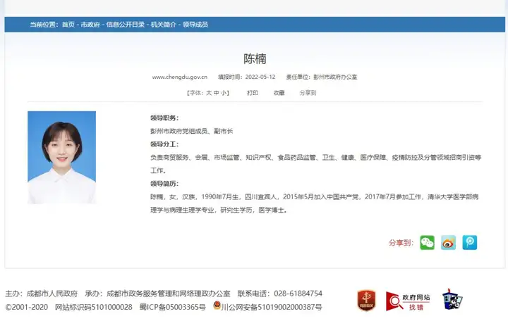 本文信息来源:成都市人民政府、百度百科、潇湘晨报、丁香园等 近日,一名 90 后的清华医学博士履任彭州市副市长的新闻在网络瞬间走红,引发热议。据悉,那名女生名叫陈楠,四川...