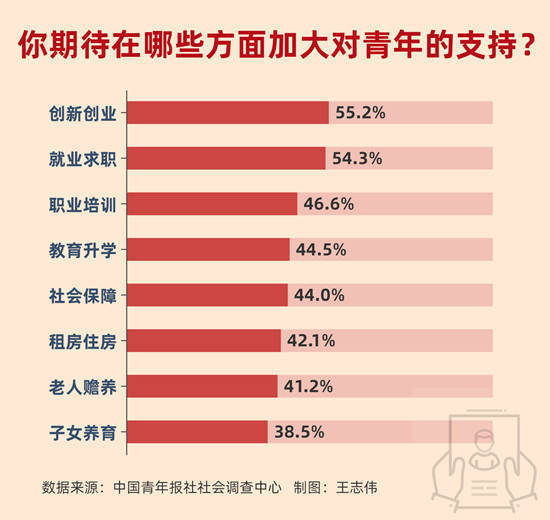 日前,中国青年报社社会调查中心联合问卷网(wenjuan.com)开展的一项有3210名青年参与的调查显示,要更好地助力青年成长成才,55.2%的受访青年期待国家在创新创业上加强支持,其次是...